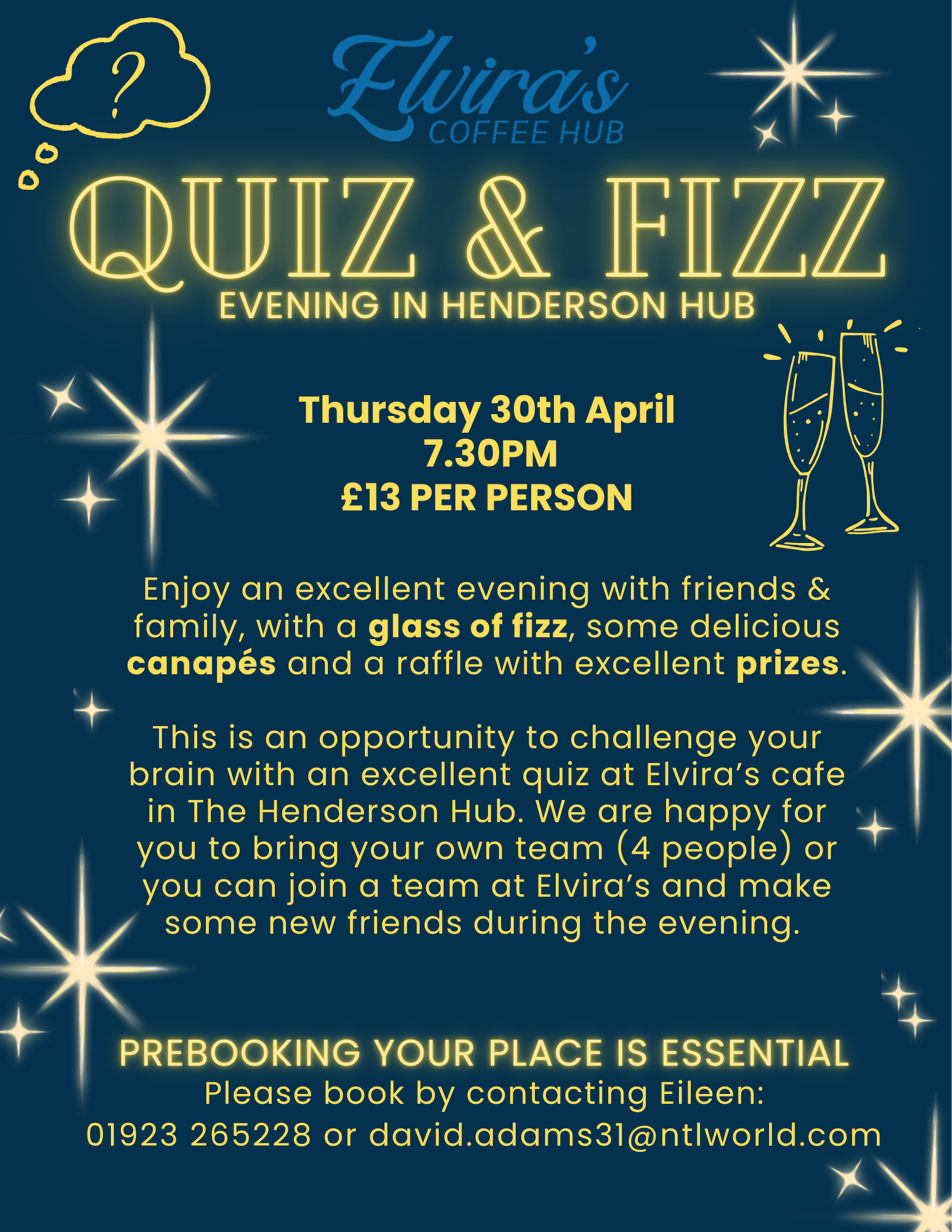 Our next Quiz & Fizz night will be on 30th April - pre-booking is essential!